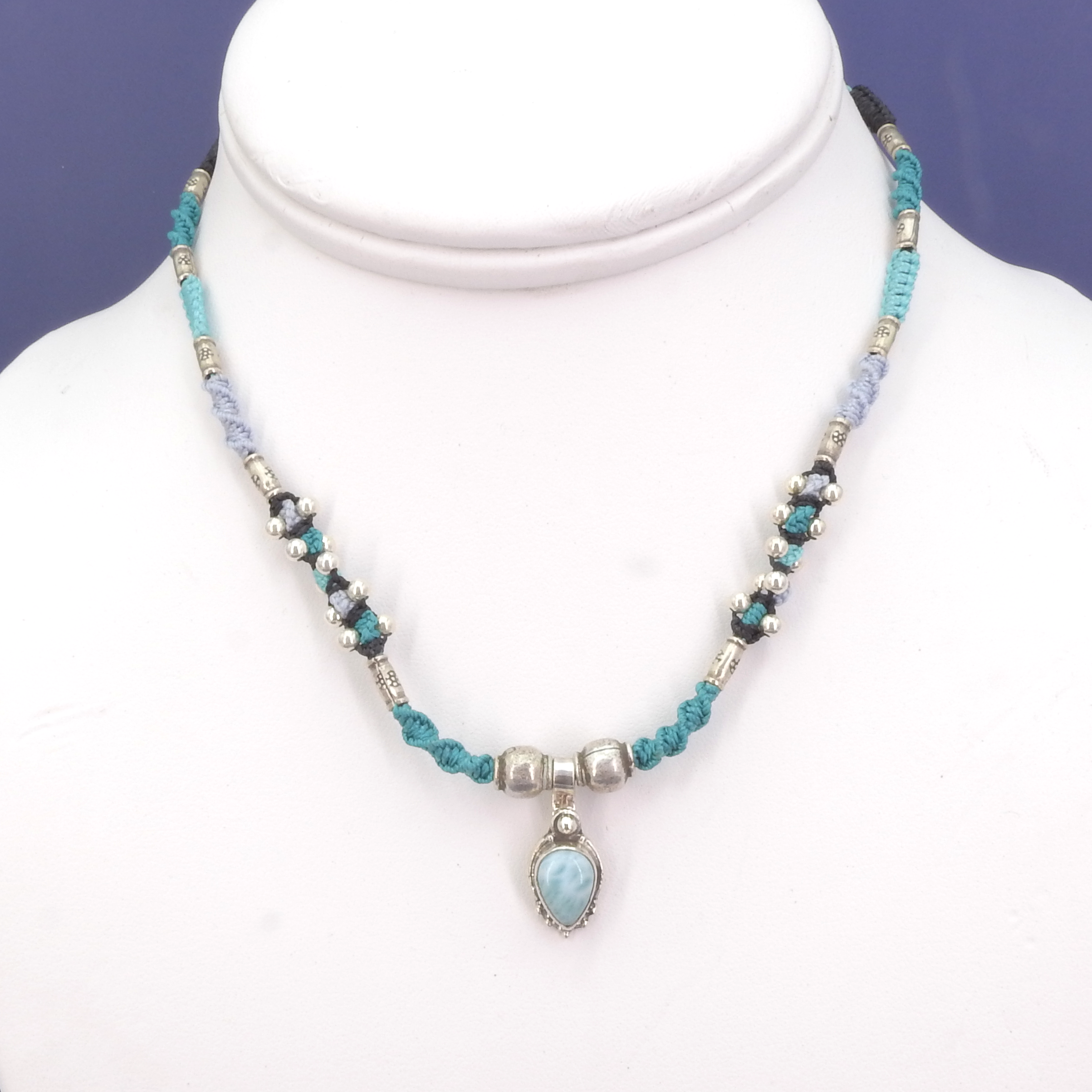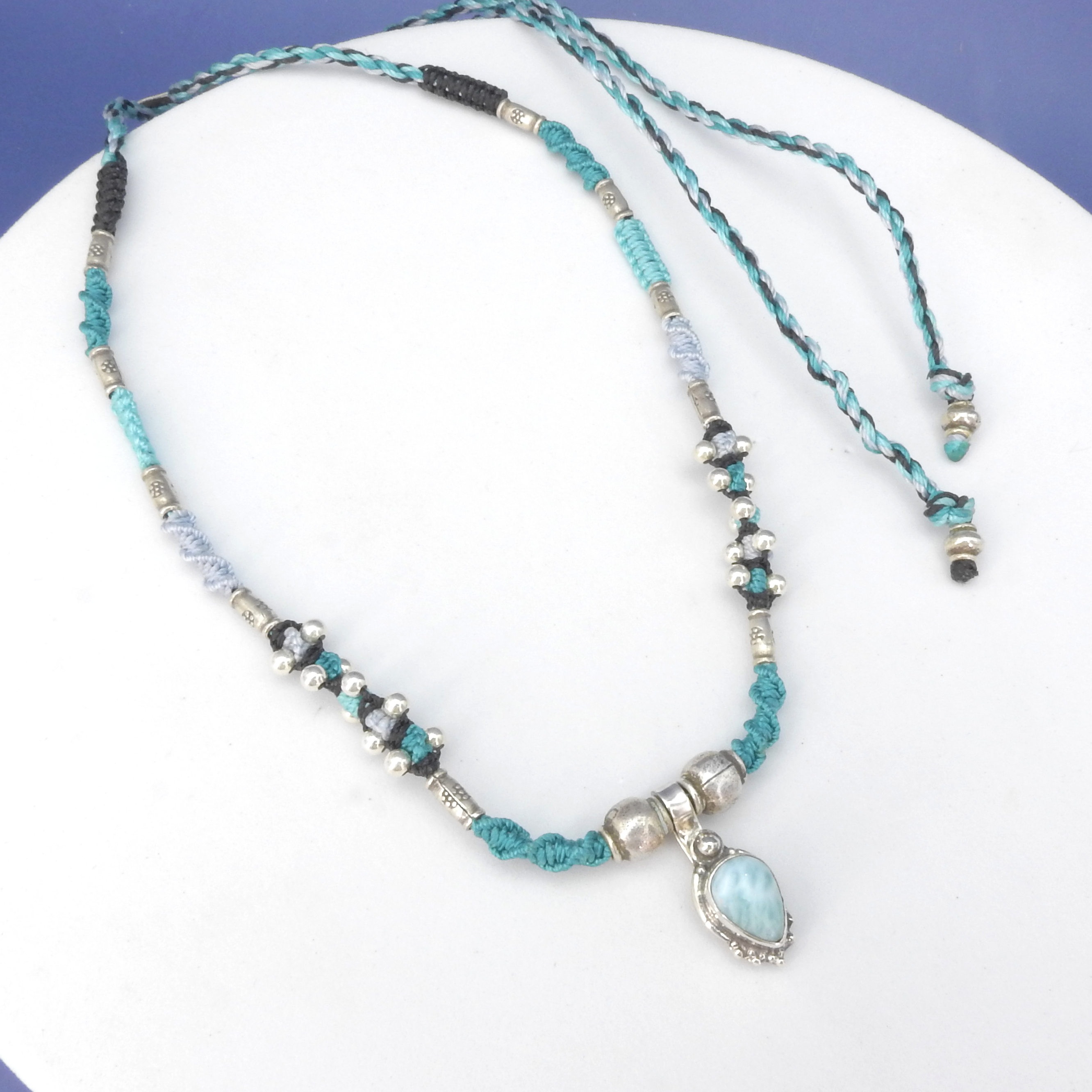 Handmade one-of-a-kind simple knotwork necklace - Focal small larimar set in sterling silver - Beads of silver are woven in - Center stone measures 7/8" x 3/8" - Adjustable to 26” long - Durable and hand washable using a toothbrush and mild soap