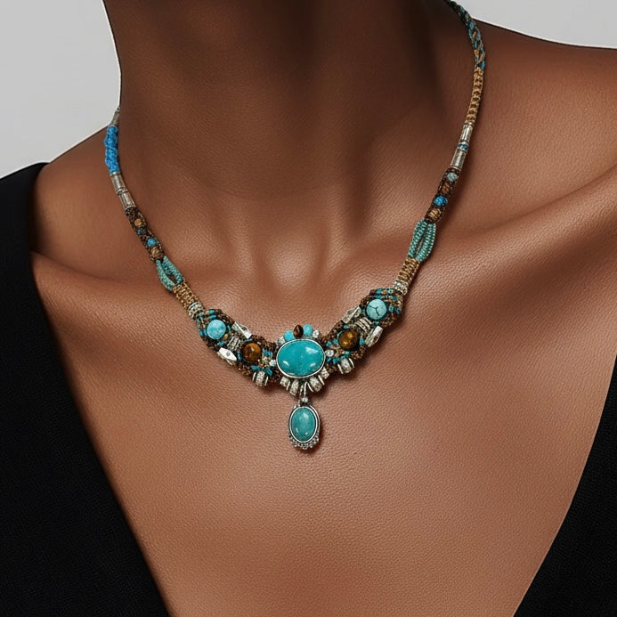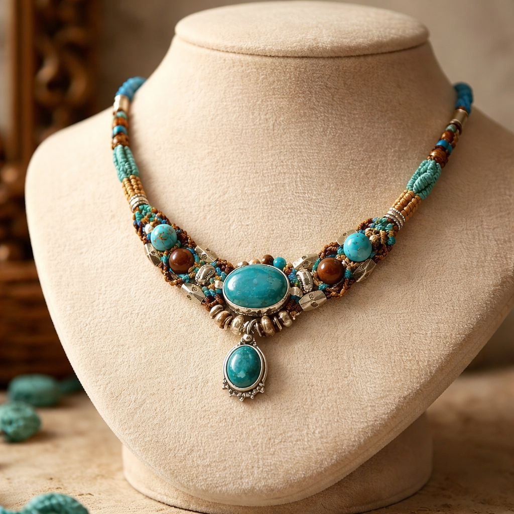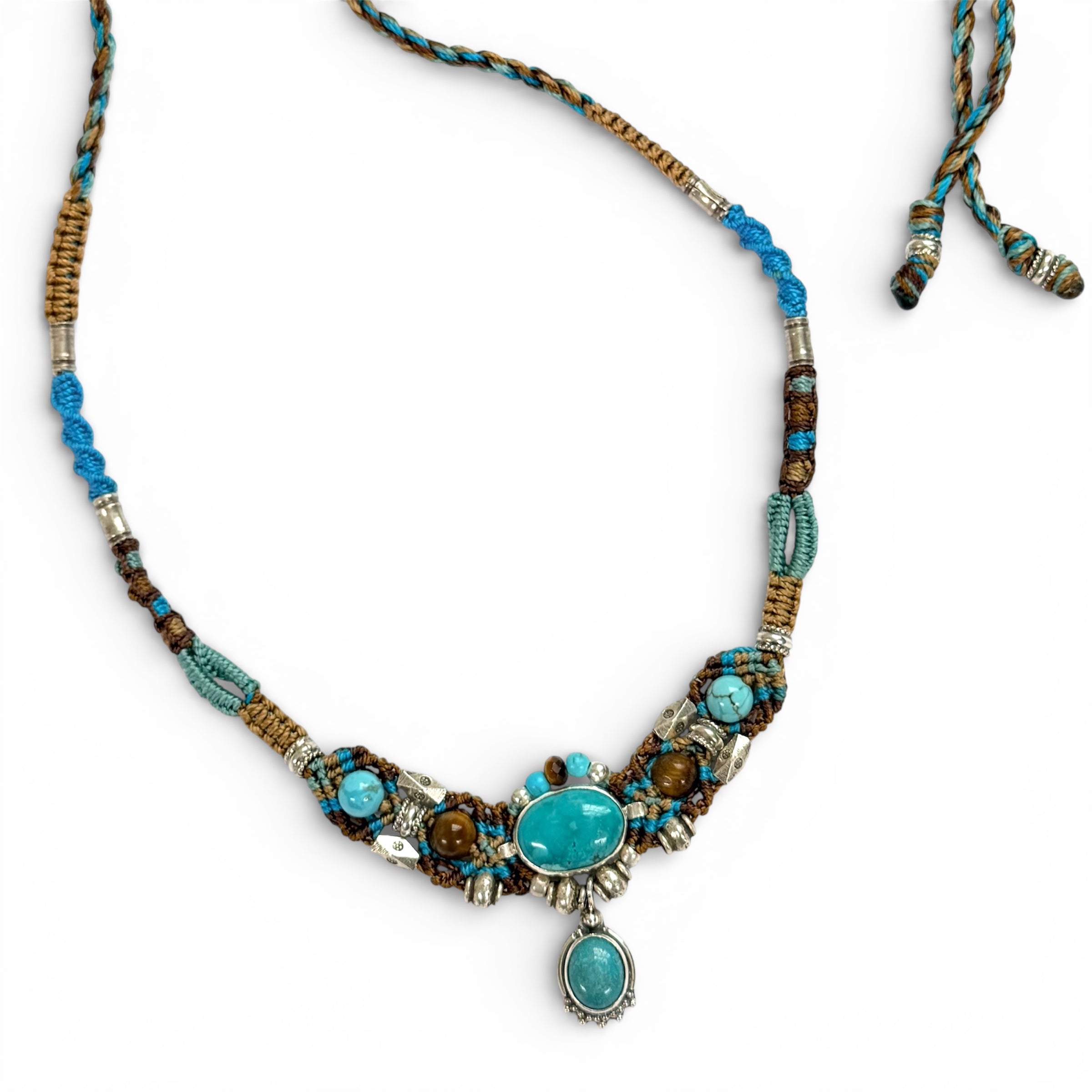 Handmade one-of-a-kind stunning small knotwork necklace - Beautiful earthtones offset by turquoise stones - Turquoise set in sterling silver - Beads of turquoise,tiger eye and silver are woven in - Center stone plus dangle measures 1 1/4" x 1/2" - 3" of decoration - Adjustable to 26” long - Durable and hand washable using a toothbrush and mild soap